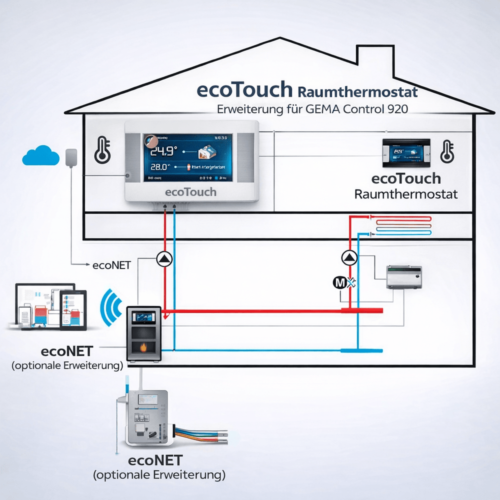 Det vejrkompenserende varmestyringssystem Gema Control 920 (Ecomax) kombinerer den nyeste teknologi med brugervenlighed og bæredygtighed. Denne innovative enhed, der allerede har solgt over 700 enheder, har i over seks år imponeret kunderne med sin pålidelighed og funktionalitet. Takket være den intuitive touchscreen-teknologi kan varmekurver, tidsintervaller og temperaturer nemt justeres. Styringssystemet understøtter også solvarmeanlæg og giver mulighed for at integrere flere varmekilder.